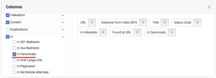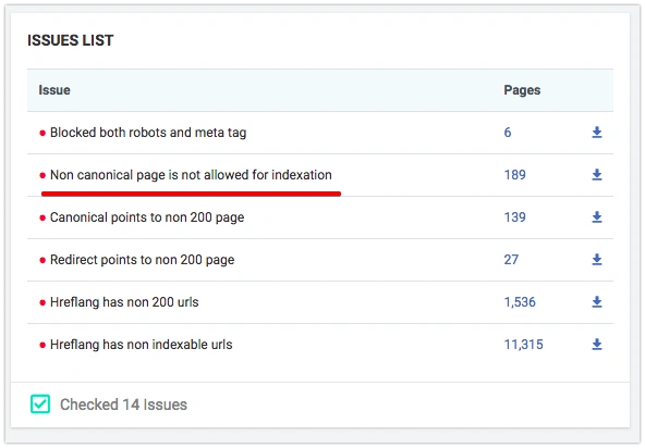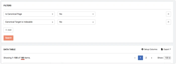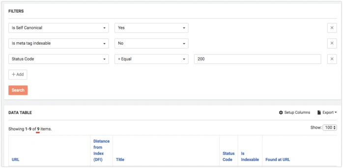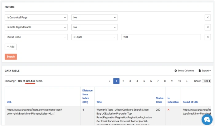 Google guidelines tell us that if the page is non-canonical, (rel=canonical tag points to the other page), this page should be open to indexation. It’s a common situation when rel=canonical tag is added to all pages indiscriminately whether these pages are open to indexation or not. This is an easy way how to find those pages with JetOctopus: